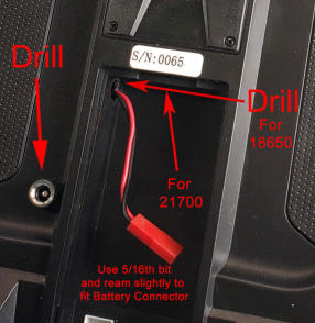 Installation is typically a five minute process. You will need a drill with a 5/16 bit to drill a hole in the case and a second into the battery compartment. For the 21700 install, the hole in the battery compartment may have to be reamed out slightly to allow the red JST connector on the battery to pass into the case to make room for the larger battery.Remove the back of the case. Removing the back takes about 30 seconds, Click here if you need instructions. All work is done on the back, put the radio aside.Drill the holes; into the top of the battery compartment for the 21700 and/or 18650 and upper side of the compartment for the 18650 as in the photograph below. Remove the nut from the coaxial power connector and pass the red connector into the top of the case. Put the nut back on and tighten with an 11mm or 7/16th tool or pliers. Do not over tighten.Feed the connector through the hole into the battery compartment and replace the back. Note that the radio internal power connector and USB socket can be a bit fiddly when replacing the back. Make sure it is aligned properly as it is loose.Both batteries are inserted label down. Before inserting the battery all the way, plug the balance connector into the radio’s power socket and connect the red JST connectors. Feed all excess wire into the case, especially with the 21700 pack. The 18650 will be a loose fit but the 21700 must be pushed in firmly. Replace the door. The 21700 will be a bit difficult to close. I usually press down on the door tab with a small screwdriver so it will slide into the slot. There should be no reason to remove the 21700 more than occasionally.Plug in the charger and the green light will indicate it’s not charging. Plug into the coaxial connector and the red light will com on and remain lit until the pack has reached nominal voltage of around 8.4V. The initial charge will take some time, 4 or 5 hours.Enjoy!
